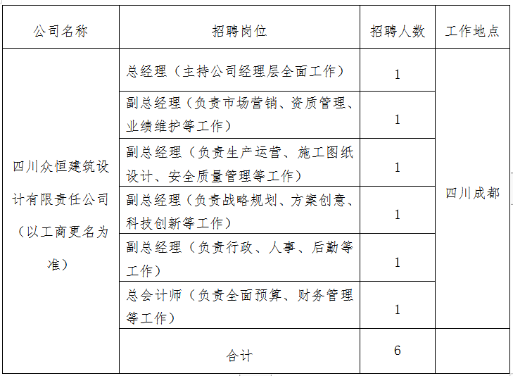 具体岗位任职条件见《四川众恒建筑设计有限责任公司(以工商更名为准)公开招聘职业经理人岗位任职条件》(见附件1)。