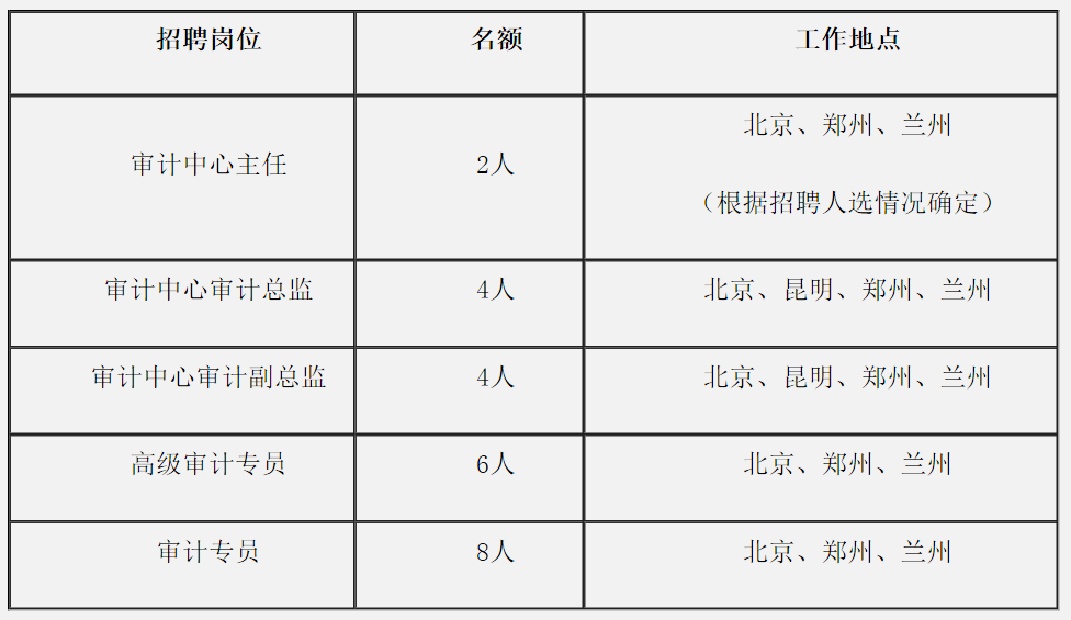 除上述基本条件,应聘人员还需符合岗位任职条件。详见《中国铝业集团有限公司审计中心2023年度公开招聘岗位一览表》(附件1)。