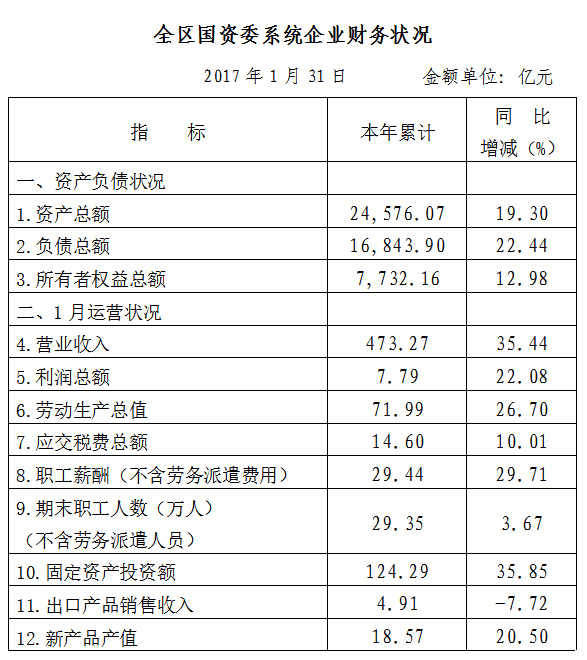 2017年1月份,广西国资委系统企业经济运行简况如下: