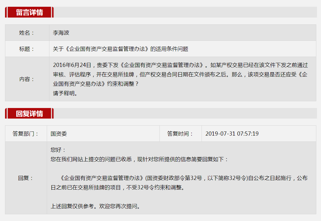 1.关于《企业国有资产交易监督管理办法》的适用条件问题