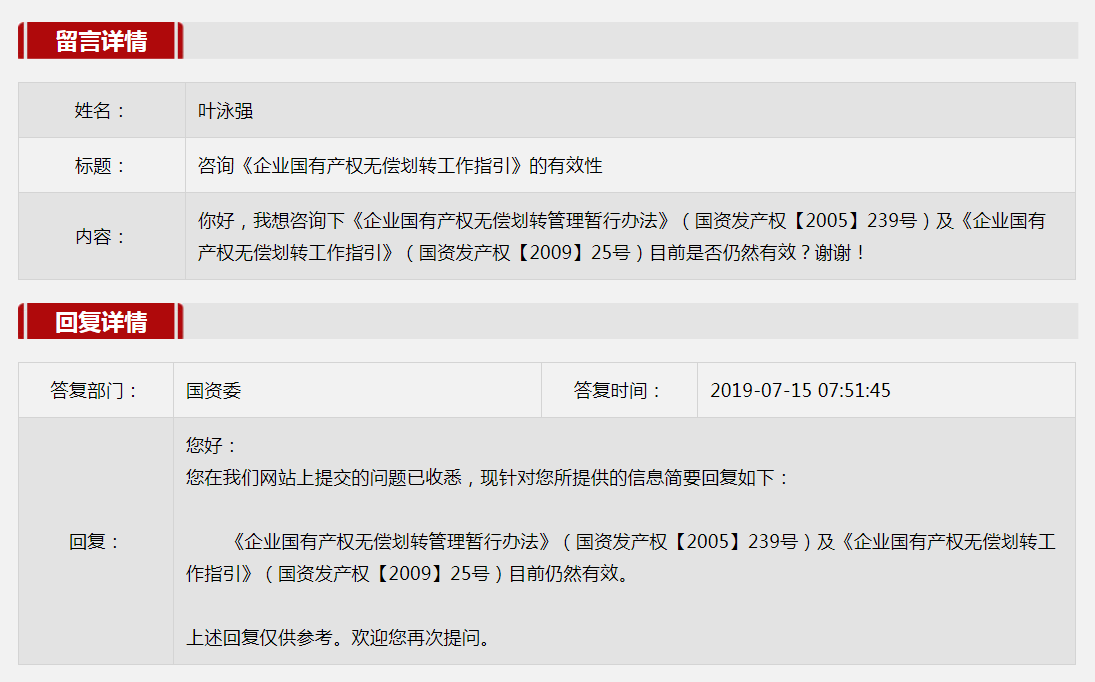 2.关于《企业国有产权无偿划转工作指引》的有效性