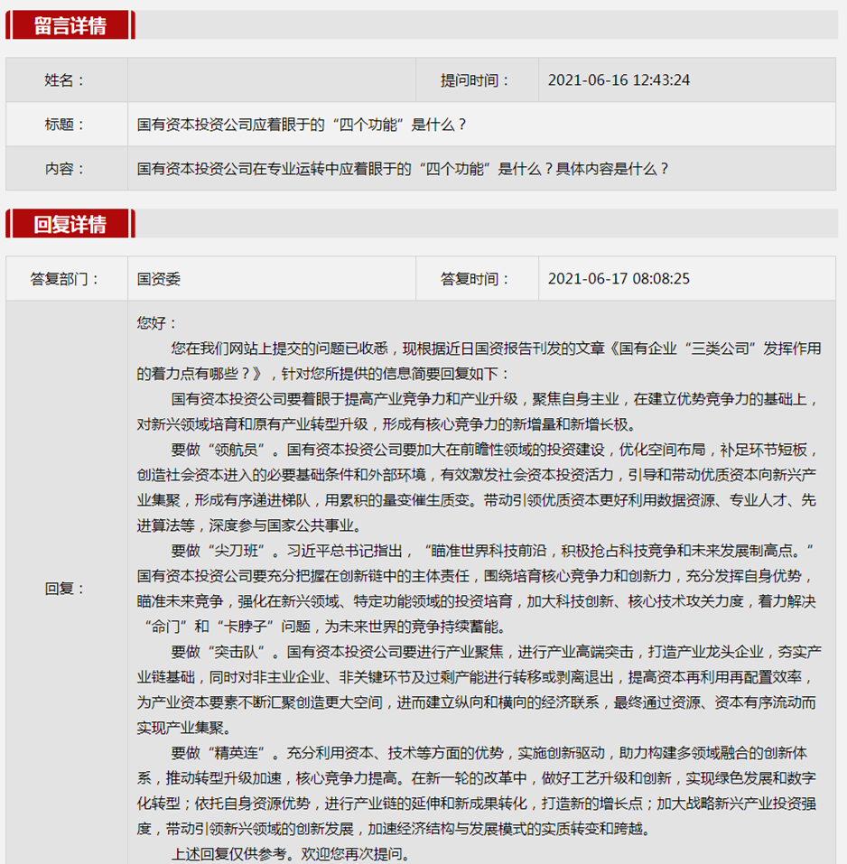 2021年6月国资委网站政务咨询栏目部分网友提出的咨询,我们初步做出了认真的回应,现选择五条关注度高、点击量高的问题,再次推荐分享。