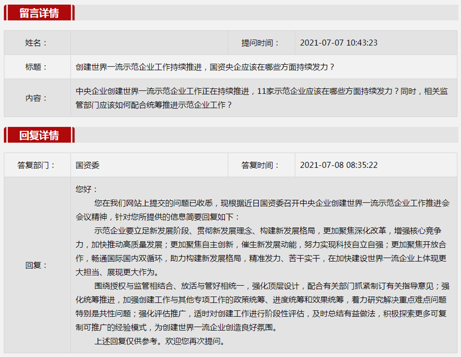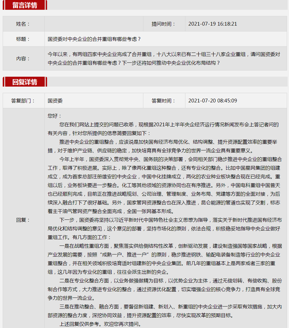 2021年7月国资委网站政务咨询栏目部分网友提出的咨询,我们初步做出了认真的回应,现选择五条关注度高、点击量高的问题,再次推荐分享。