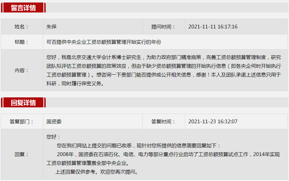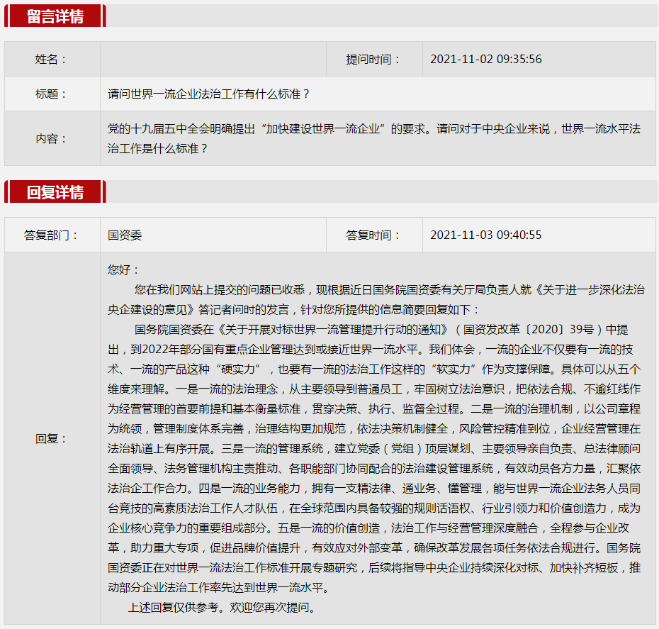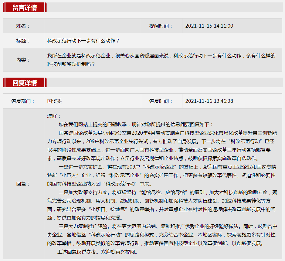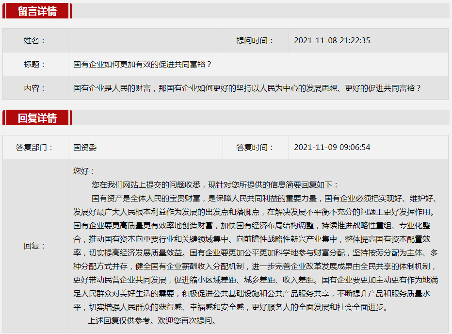 2021年11月国资委网站政务咨询栏目部分网友提出的咨询,我们初步做出了认真的回应,现选择五条关注度高、点击量高的问题,再次推荐分享。