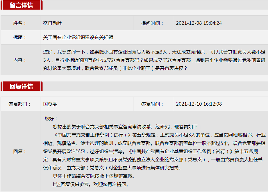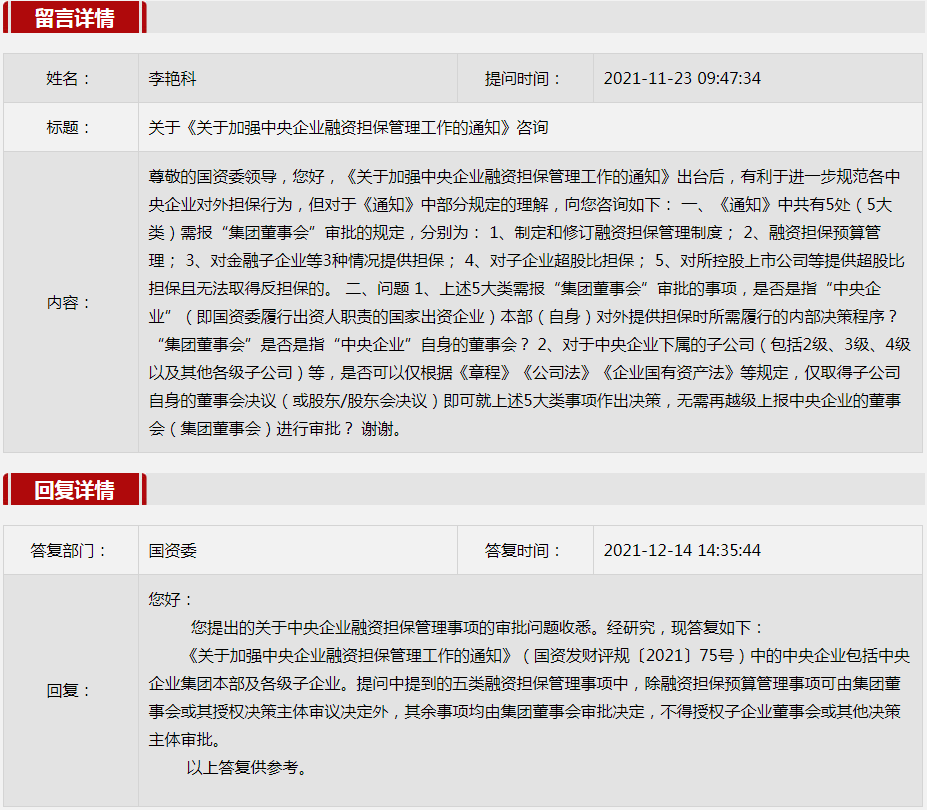 2021年12月国资委网站政务咨询栏目部分网友提出的咨询,我们初步做出了认真的回应,现选择五条关注度高、点击量高的问题,再次推荐分享。