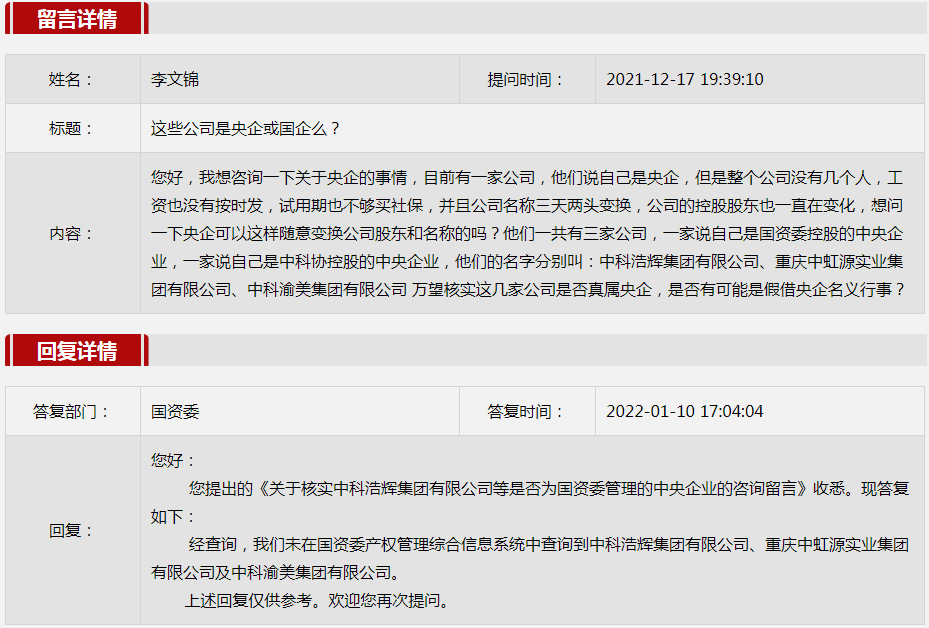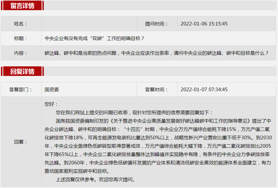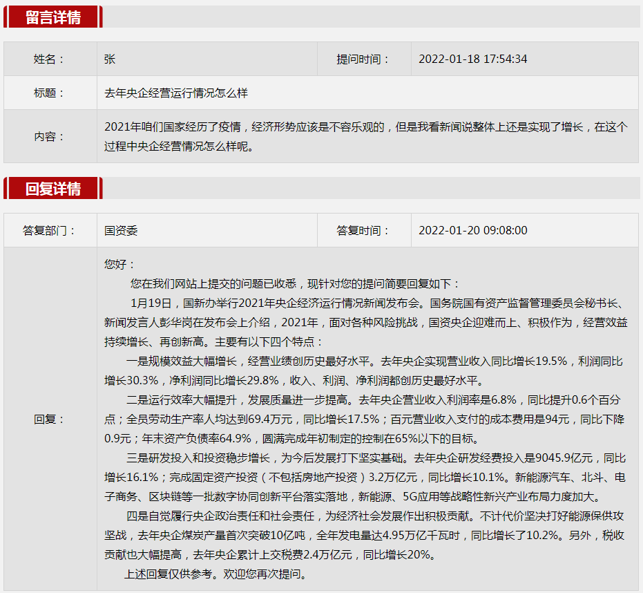2022年1月国资委网站政务咨询栏目部分网友提出的咨询,我们初步做出了认真的回应,现选择五条关注度高、点击量高的问题,再次推荐分享。