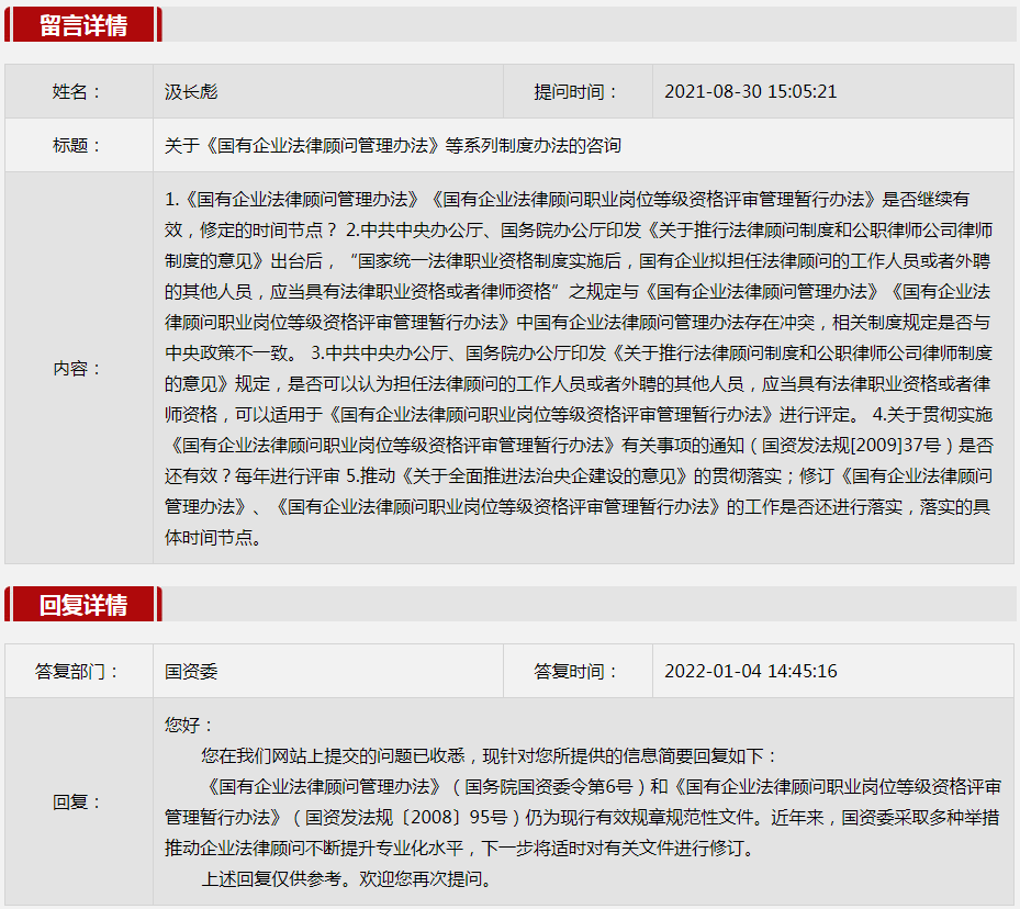 5.关于《国有企业法律顾问管理办法》等系列制度办法的咨询。