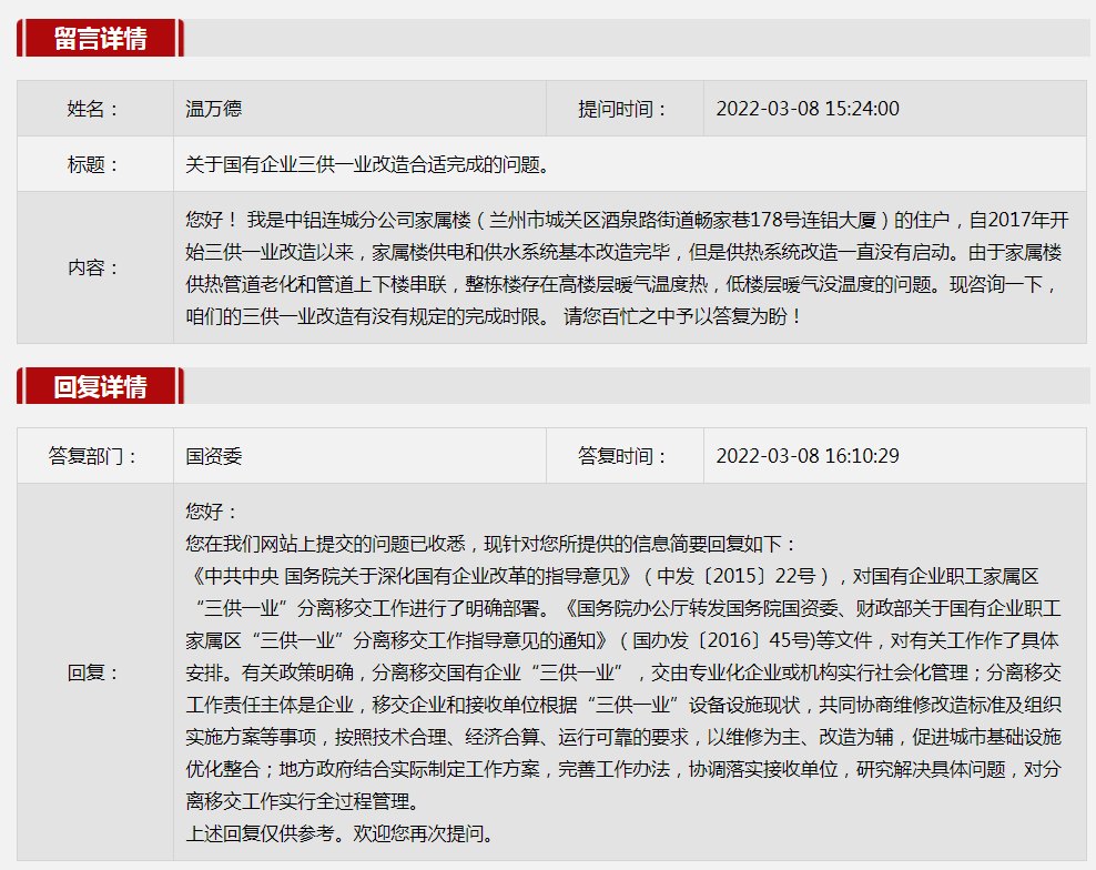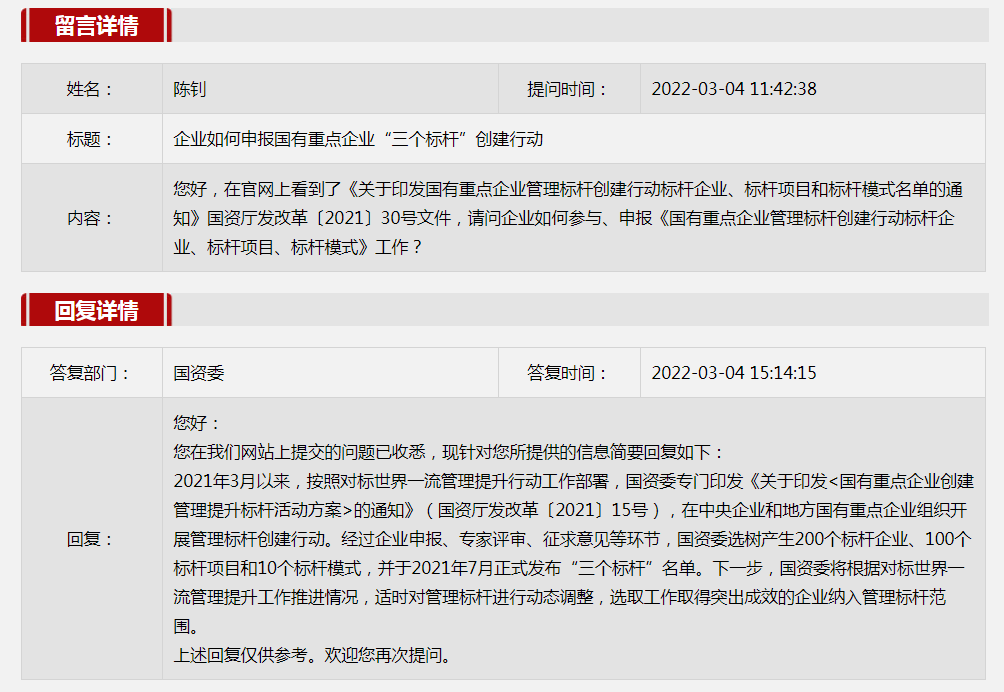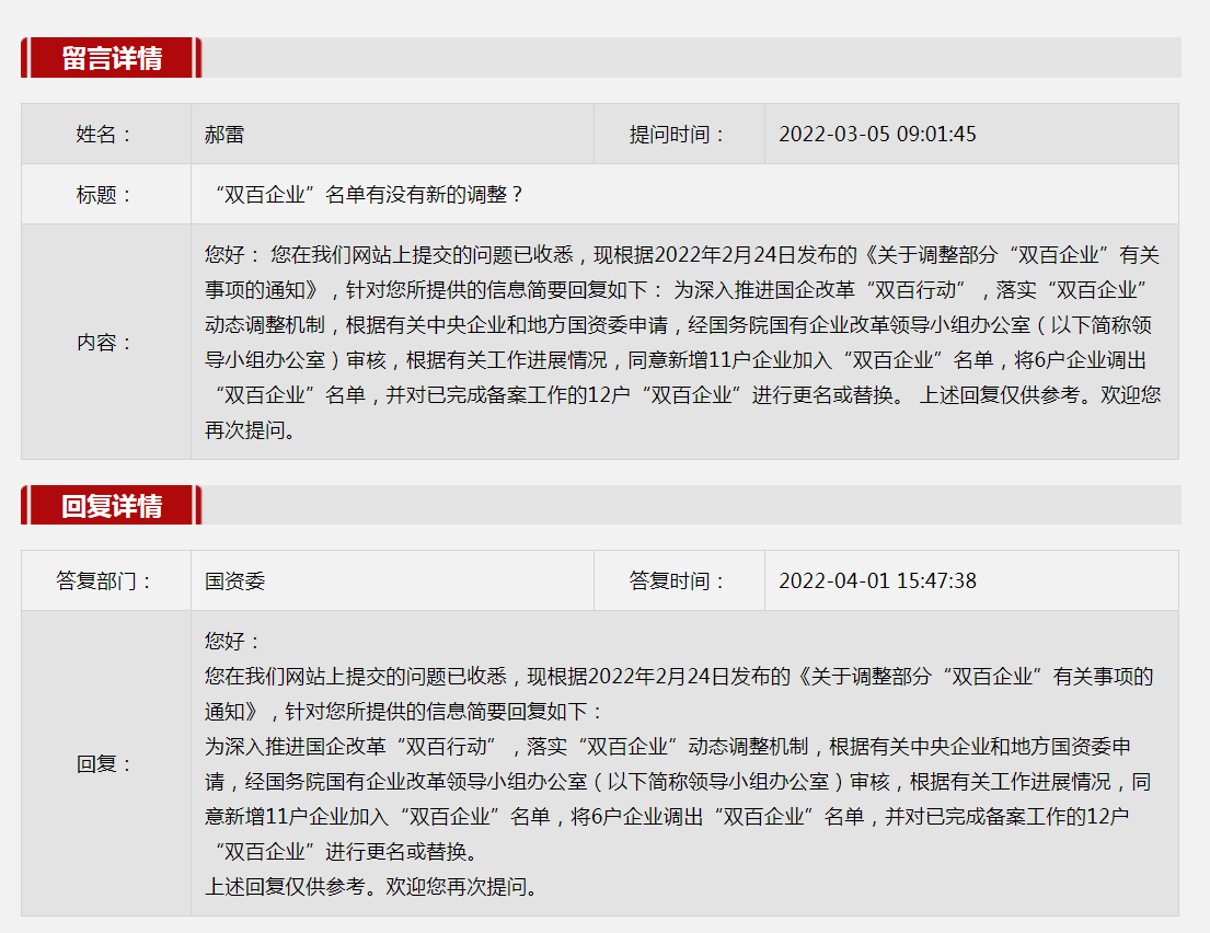 2022年3月国资委网站政务咨询栏目部分网友提出的咨询,我们初步做出了认真的回应,现选择五条关注度高、点击量高的问题,再次推荐分享。
