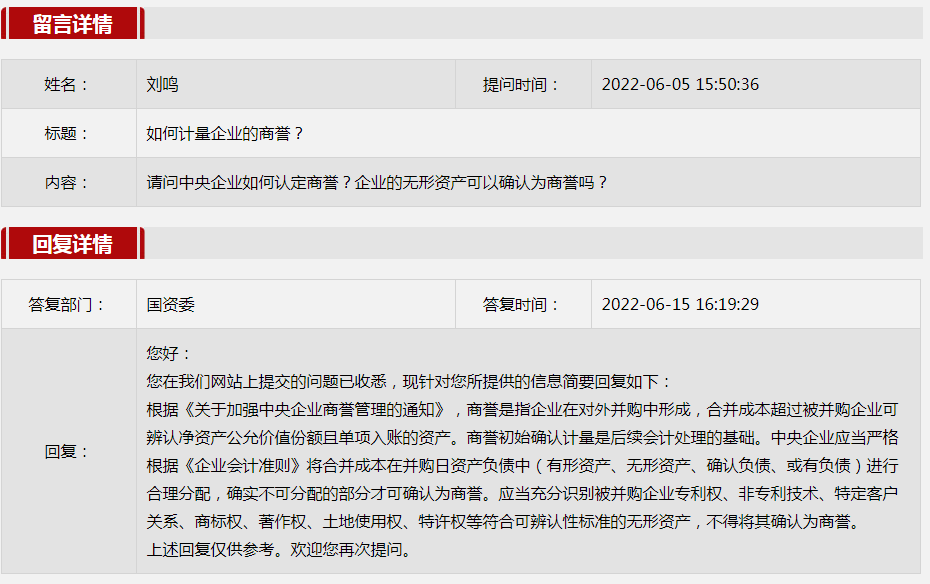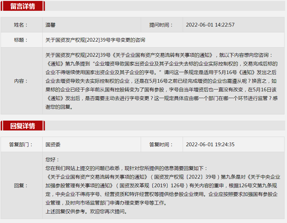 2022年6月国资委网站政务咨询栏目部分网友提出的咨询,我们初步做出了认真的回应,现选择五条关注度高、点击量高的问题,再次推荐分享。