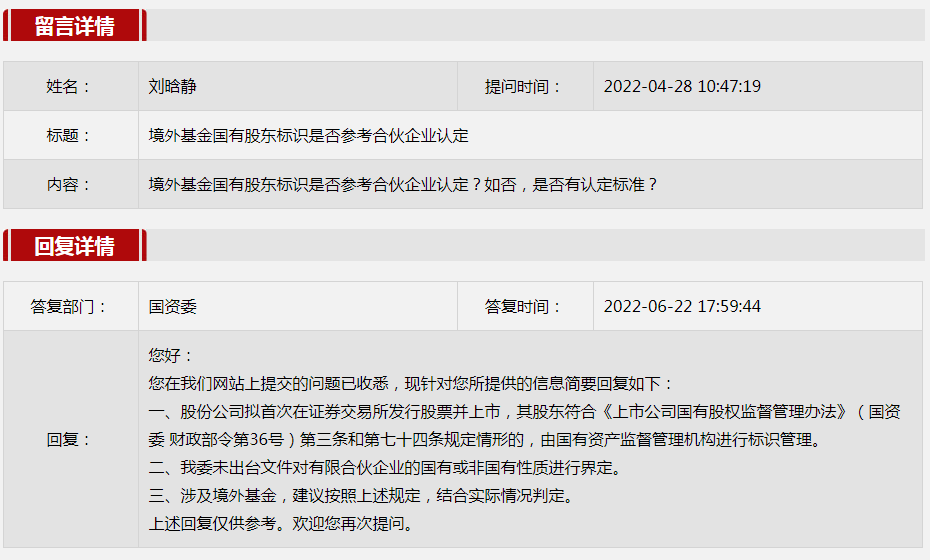 5.关于境外基金国有股东标识是否参考合伙企业认定的问题。