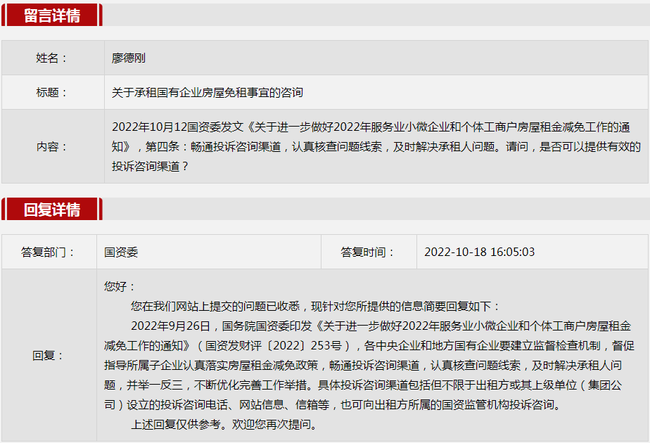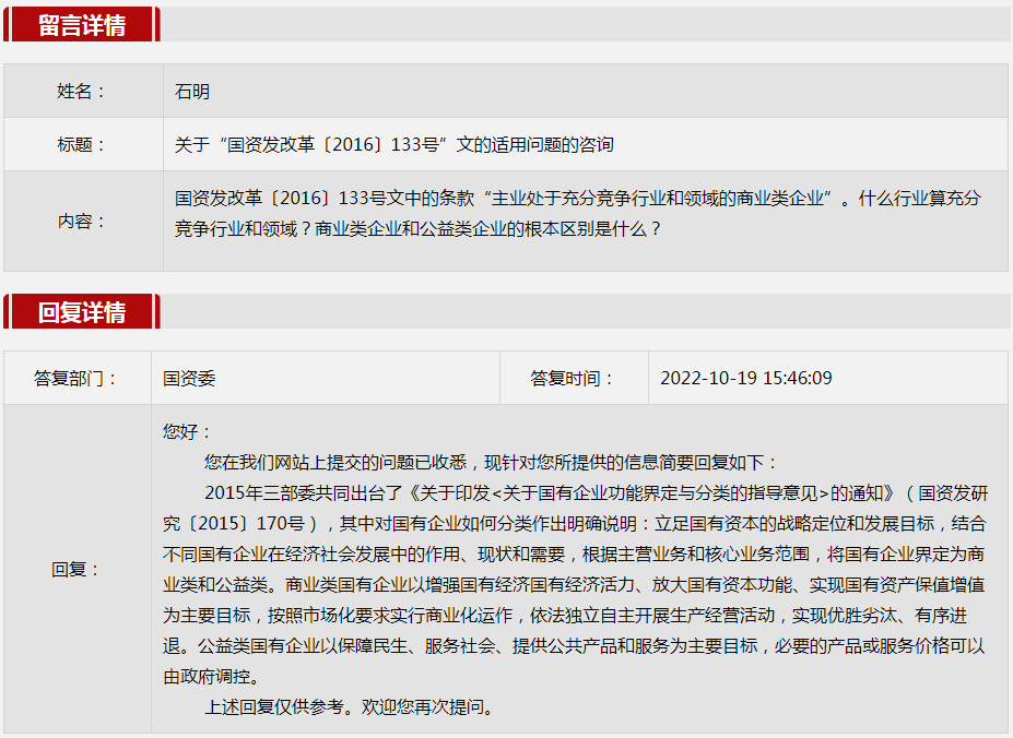 2022年10月国资委网站政务咨询栏目部分网友提出的咨询,我们初步做出了认真的回应,现选择五条关注度高、点击量高的问题,再次推荐分享。