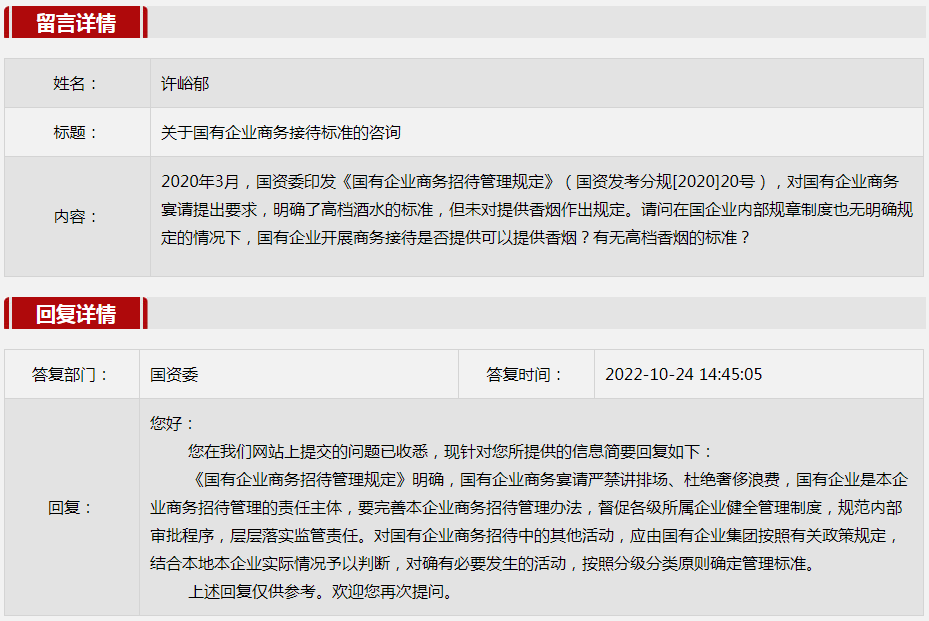 5.关于国有企业商务接待标准的咨询。