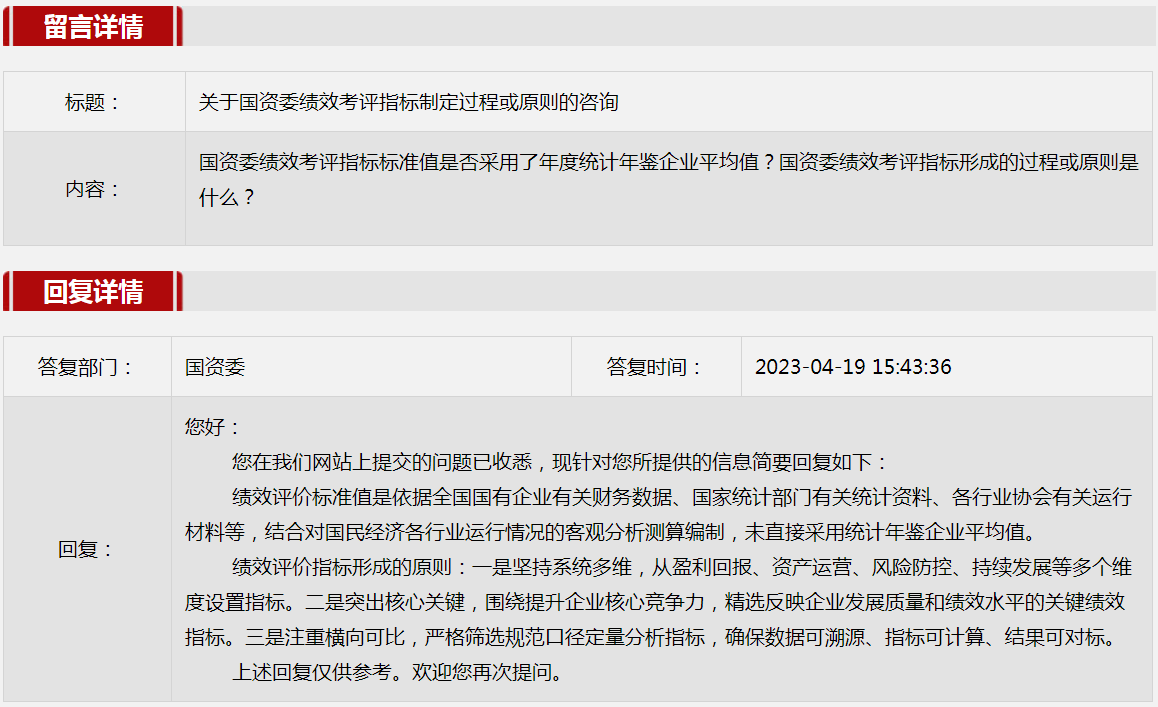 5.关于国资委绩效考评指标制定过程或原则的咨询。