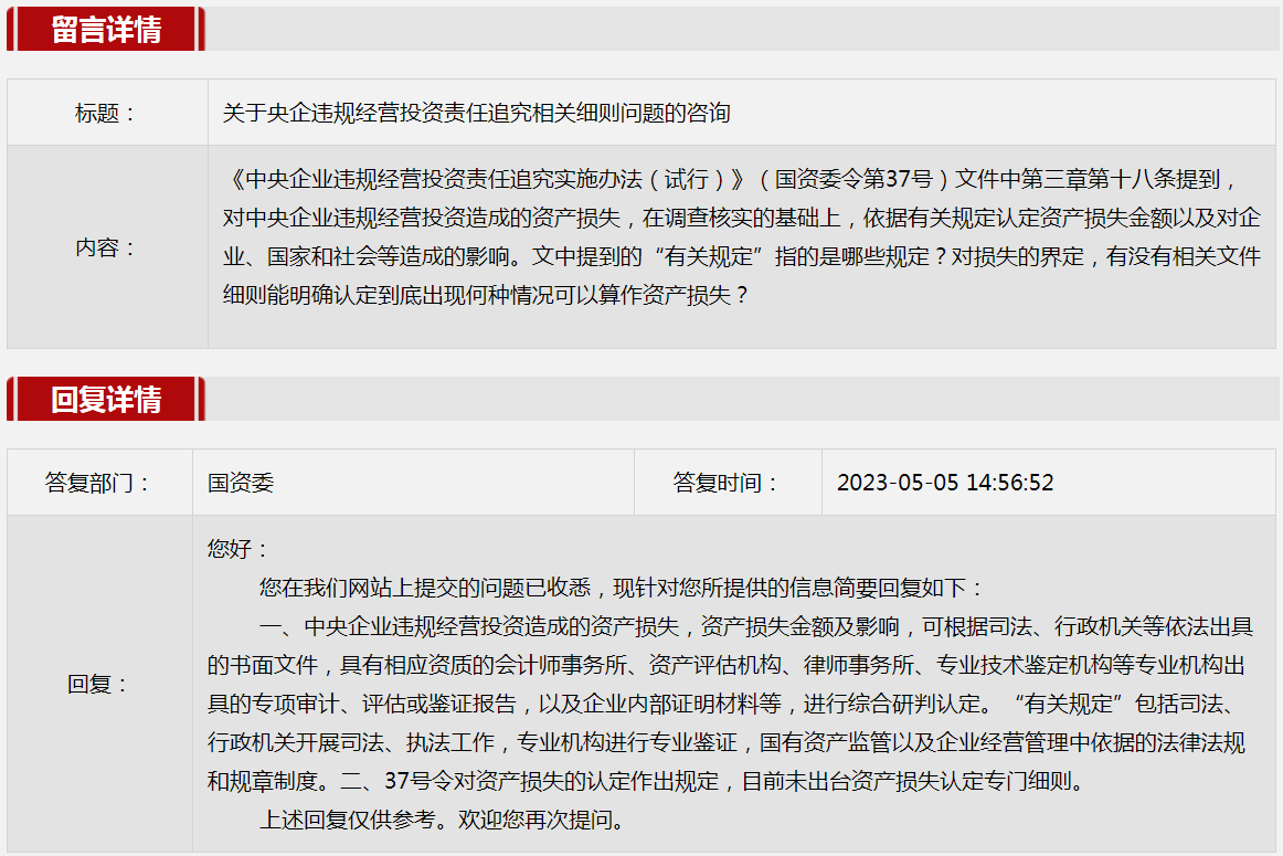 1.关于央企违规经营投资责任追究相关细则问题的咨询。