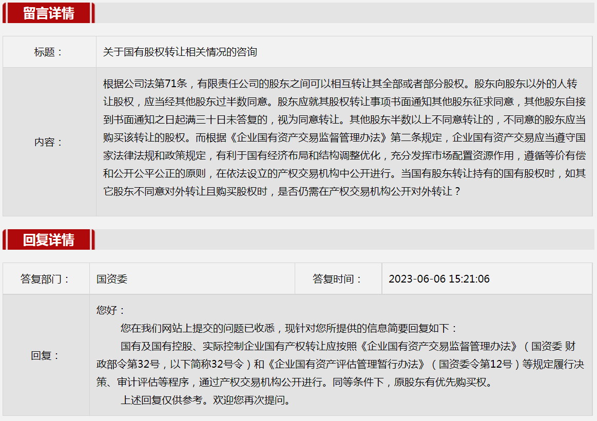 1.关于国有股权转让相关情况的咨询。