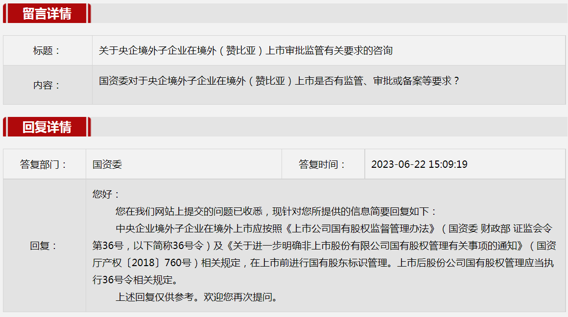 5.关于央企境外子企业在境外(赞比亚)上市审批监管有关要求的咨询。
