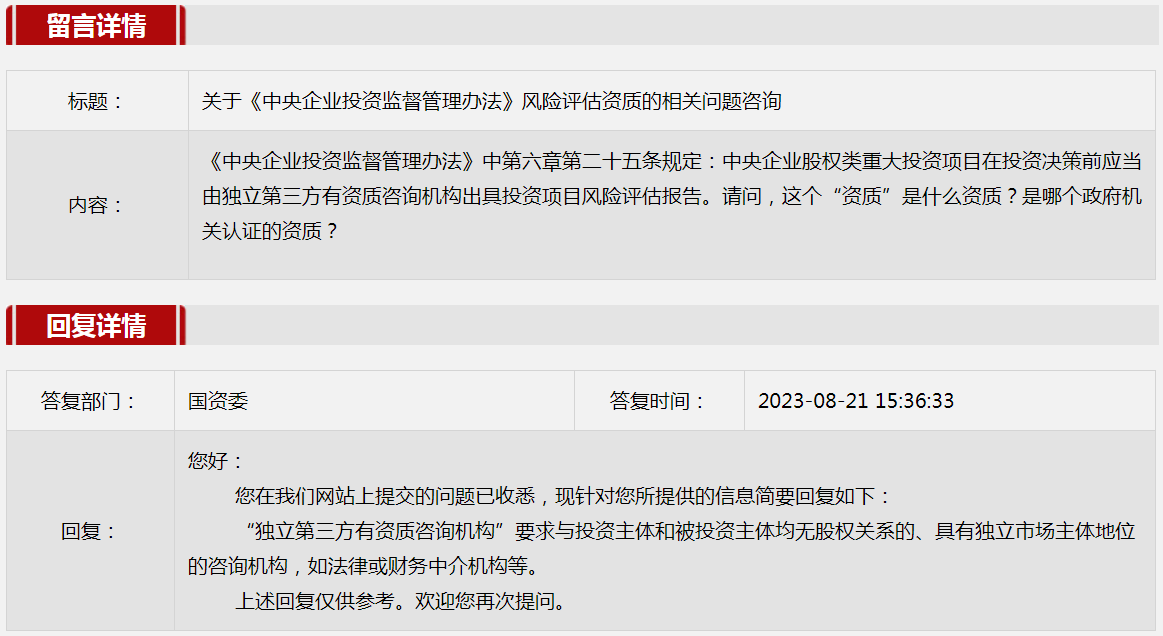 5.关于《中央企业投资监督管理办法》风险评估资质的相关问题咨询。