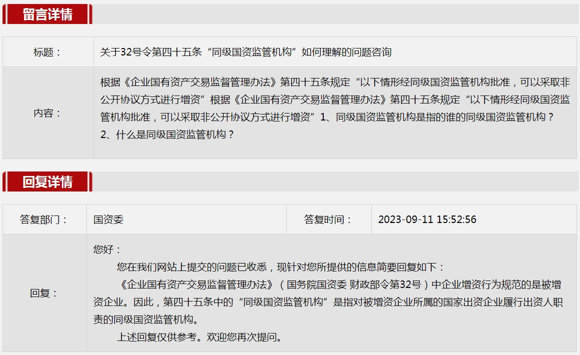 2.关于32号令第四十五条“同级国资监管机构”如何理解的问题咨询。
