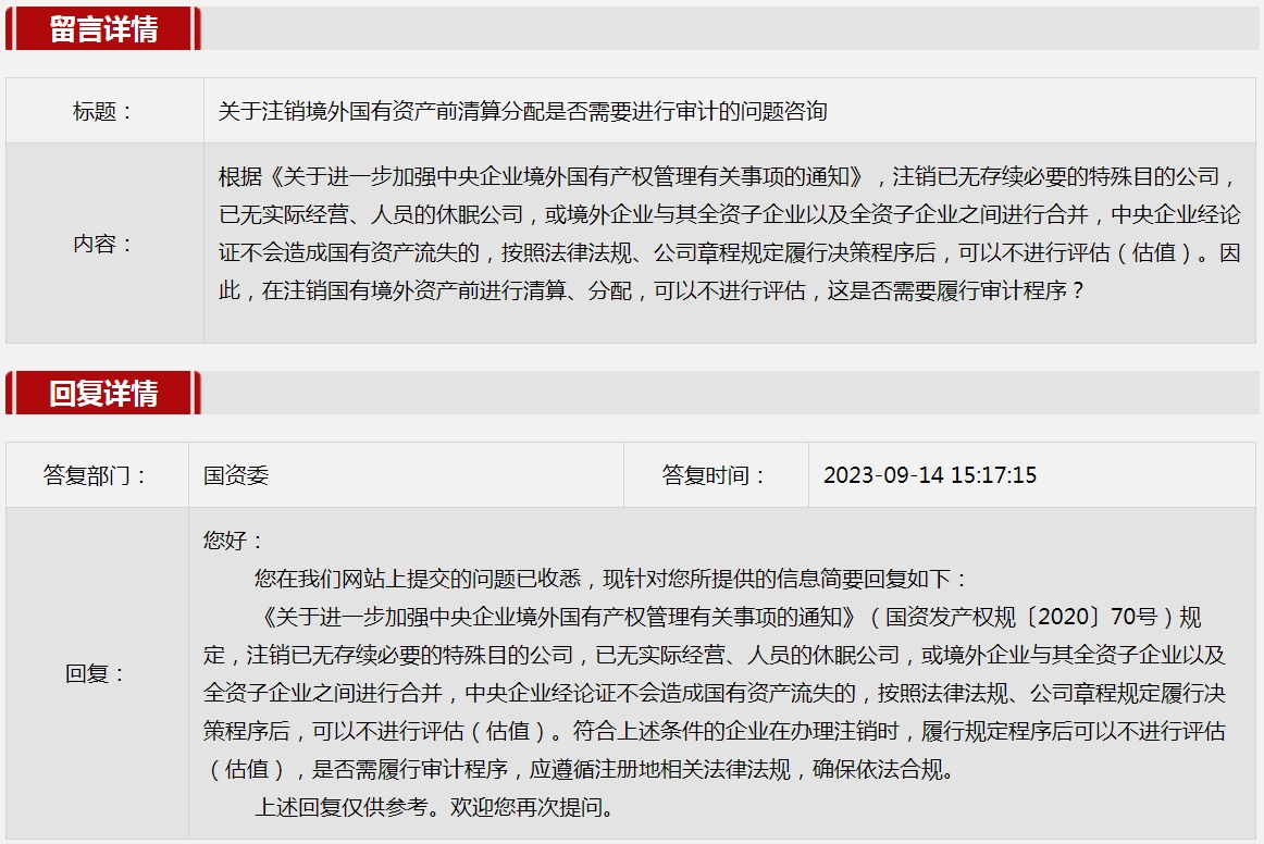 3.关于注销境外国有资产前清算分配是否需要进行审计的问题咨询。