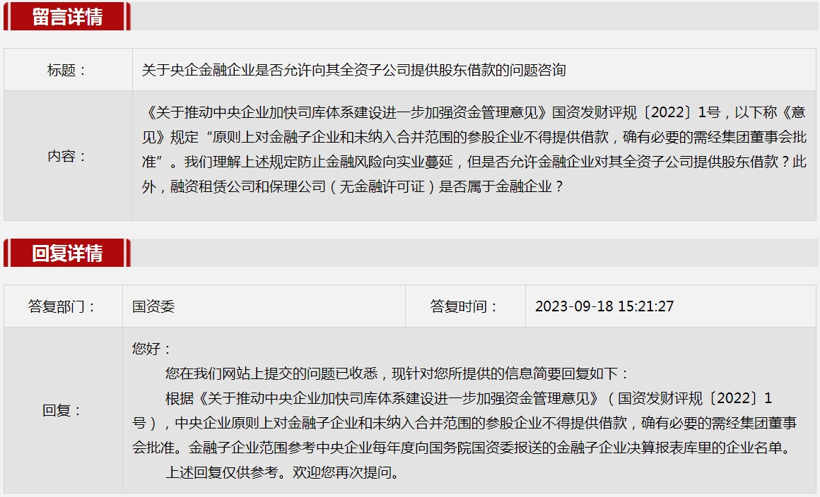 4.关于央企金融企业是否允许向其全资子公司提供股东借款的问题咨询。