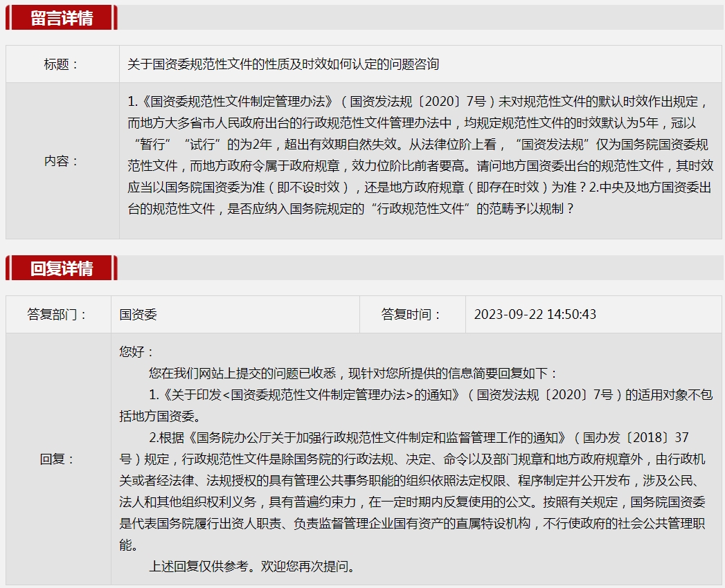 5.关于国资委规范性文件的性质及时效如何认定的问题咨询。