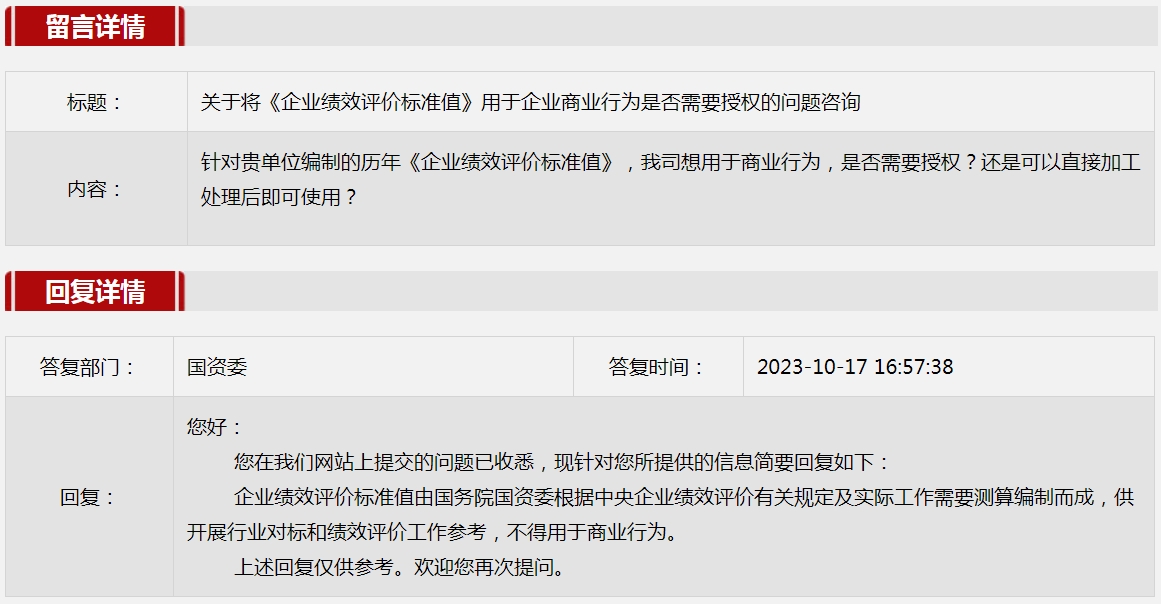 2.关于将《企业绩效评价标准值》用于企业商业行为是否需要授权的问题咨询。