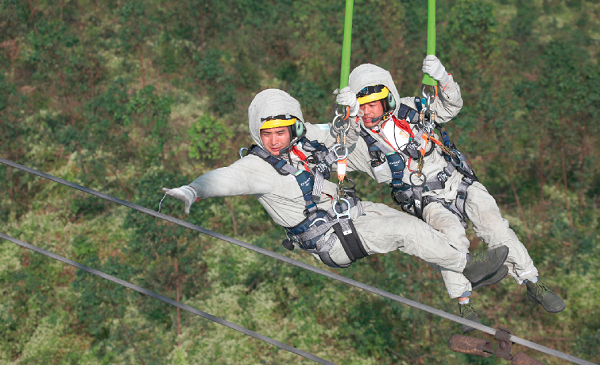 广东省输变电工程有限公司开展国内首次直升机带导线X光检测作业时,带点作业员靠近电厂瞬间。(杨惠平 摄)