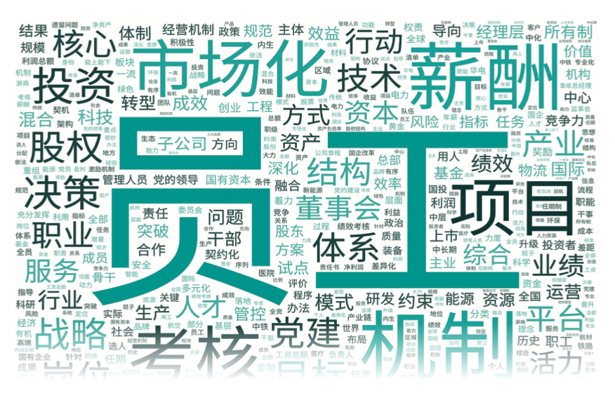 去掉词频出现最高的“企业、公司、发展、改革、经营、管理、集团、工作”等相对抽象的词汇,出现频次最多的词是员工(906次)、市场化(883次)、机制(875次)等。