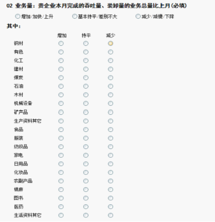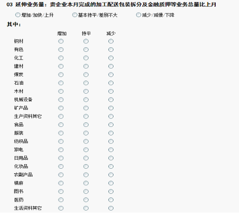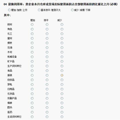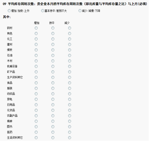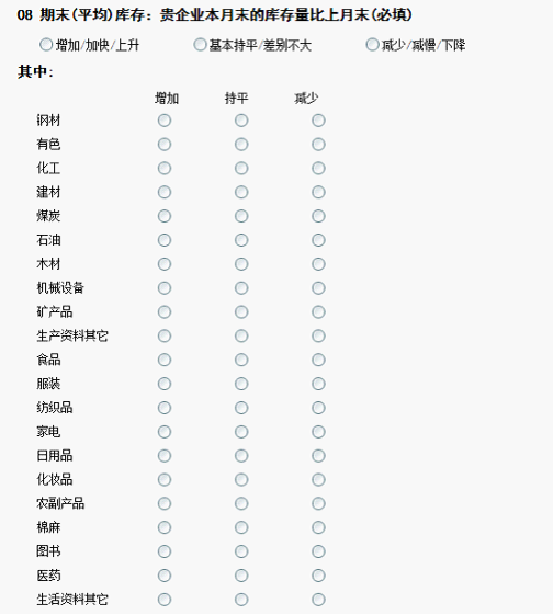 中国仓储指数体系调查包含了生产资料和消费品两大类。涉及钢材、有色、化工、建材、煤炭、石油、木材、机械设备、矿产品等十余类生产资料的品种和食品、服装、纺织品、家电、日用品、化妆品、农副产品、棉麻、医药、图书等十余类消费品的品种。