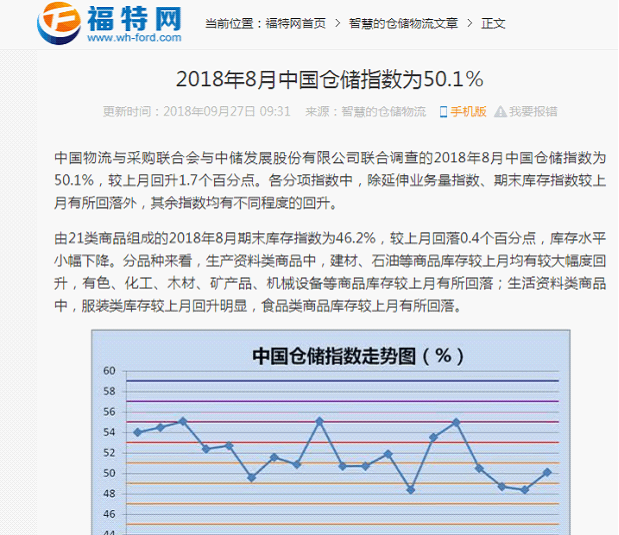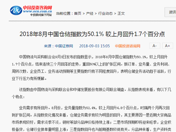 2018年8月中国仓储指数为50.1%