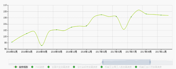 机械工业趋势指数=制造业采购经理人指数同比发展速度×0.2+全国外贸进出口总额同比发展速度×0.1+全社会固定资产投资额同比发展速度×0.25+机械工业用工人数前三期同比发展速度算数平均值×0.2+机械工业订货前三期同比发展速度的算术平均值×0.25