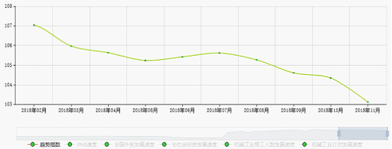 通过2018年趋势指数编制方法的更新调整,中机联趋势指数的预判周期已延伸至近两个月,且数值的无规律扰动明显减少(2016、2017年如图1,2018年如图2),趋势指数的预判效果得以提升,反映出了2018年机械工业稳中趋缓、压力增大的走势。
