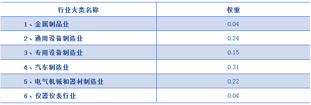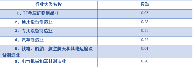 机械工业行业指数=金属制品业工业增加值同比发展速度×0.04+通用设备制造业工业增加值同比发展速度×0.24+专用设备制造业工业增加值同比发展速度×0.15+汽车制造业工业增加值同比发展速度×0.31+电气机械和器材制造业工业增加值同比发展速度×0.22+仪器仪表行业工业增加值同比发展速度×0.04