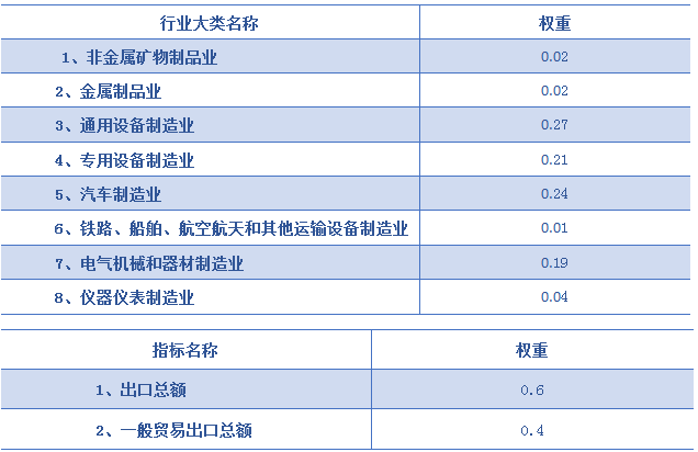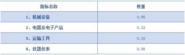 机械工业外贸出口指数=机械设备出口总额同比发展速度×0.55+电器及电子产品出口总额同比发展速度×0.22+运输工具出口总额同比发展速度×0.15+仪器仪表出口总额同比发展速度×0.08