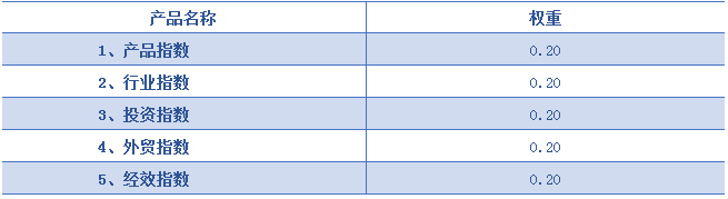 行业景气指数=产品指数×0.2+行业指数×0.2+投资指数×0.2+外贸指数×0.2+经效指数×0.2