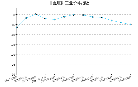 2018年8月,非金属矿工业产品出厂价格指数为115.03,比上月下降0.84%,比去年同月上涨1.34%,一月至本月平均比去年同期上涨12.80%。 图 1:非金属矿工业产品出厂价格指数
