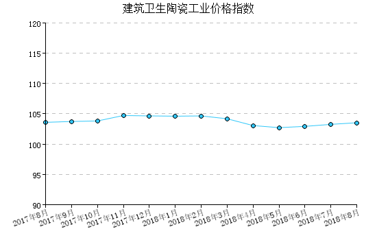 2018年8月,建筑卫生陶瓷工业产品出厂价格指数为103.53,比上月上涨0.26%,比去年同月下降0.07%,一月至本月平均比去年同期上涨0.10%。 图 1:建筑卫生陶瓷工业产品出厂价格指数