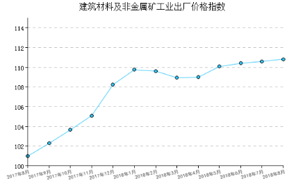 2018年8月,建材价格指数为110.83,比上月上涨0.21%,比去年同月上涨9.76%,一月至本月平均比去年同期上涨11.15%。 价格指数比上月上涨的行业有:混凝土与水泥制品工业、防水建筑材料工业、石灰石膏工业、建筑用石工业、建筑技术玻璃工业、;价格指数比上月下降的行业有水泥工业、墙体材料工业、轻质建筑材料工业、隔热保温材料工业、粘土和砂石开采工业。