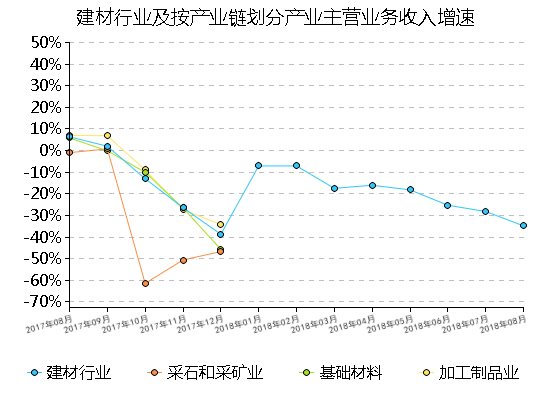 2018年8月规模以上工业增加值同比增长6.10%,累计增长6.50%。 跟其他工业行业相比,建材行业增加值增速低于设备制造、电器机械和器材制造、电力、热力生产及供应等行业,高于化学原料和化学品制造、黑色金属冶炼和压延、有所金属冶炼和压延等行业。