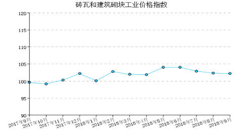 2018年9月,砖瓦和建筑砌块工业产品出厂价格指数为102.17,比上月下降0.16%,比去年同月上涨2.60%,一月至本月平均比去年同期上涨2.72%。