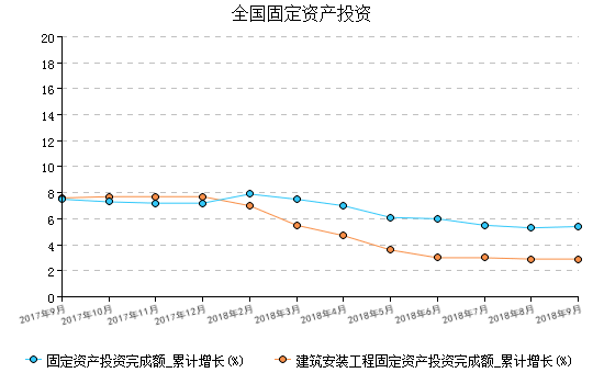 2018年9月全国固定资产投资累计增速增长5.4%,其中建筑安装工程投资累计增速增长2.9%。