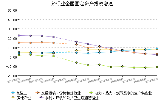 分行业来看:房地产业累计投资增速增长8个百分点;水利、环境和公共设施投资增速增长2个百分点;交通运输、仓储和邮政业投资增速增长3个百分点;制造业投资增速增长9个百分点。