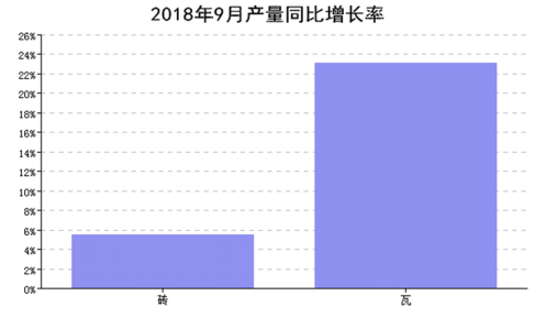 2018年9月规模以上工业增加值同比增长5.80%,累计增长增长6.40%。 跟其他工业行业相比,建材行业增加值增速低于设备制造、电器机械和器材制造、电力、热力生产及供应等行业,高于化学原料和化学品制造、黑色金属冶炼和压延、有所金属冶炼和压延等行业。