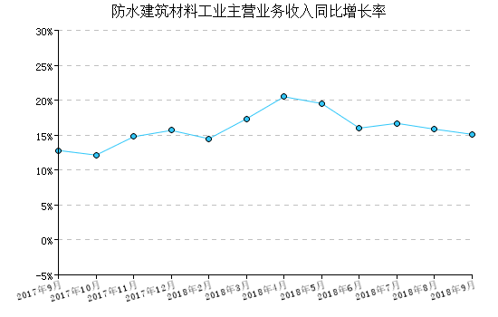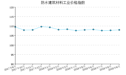 2018年9月,防水建筑材料工业产品出厂价格指数为108.02,比上月上涨0.28%,比去年同月下降1.41%,一月至本月平均比去年同期下降0.67%。