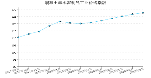 2018年9月,混凝土与水泥制品工业产品出厂价格指数为127.56,比上月上涨0.72%,比去年同月上涨15.59%,一月至本月平均比去年同期上涨17.06%。 图 1:混凝土与水泥制品工业产品出厂价格指数