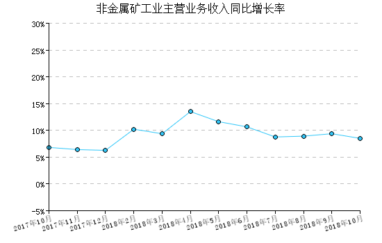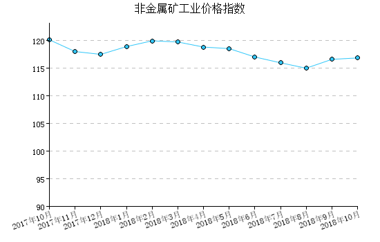 2018年10月,非金属矿工业产品出厂价格指数为116.89,比上月上涨0.22%,比去年同月下降2.73%,一月至本月平均比去年同期上涨9.51%。