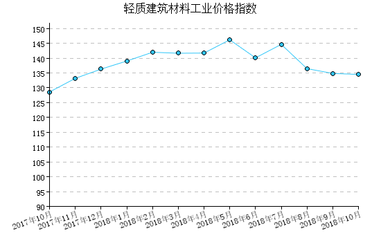 2018年10月,轻质建筑材料工业产品出厂价格指数为134.50,比上月下降0.25%,比去年同月上涨4.61%,一月至本月平均比去年同期上涨17.36%。