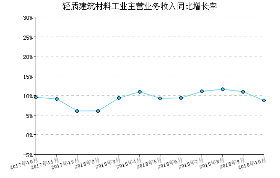 2018年10月规模以上工业增加值同比增长5.90%,累计增长增长6.40%。 跟其他工业行业相比,建材行业增加值增速低于设备制造、电器机械和器材制造、电力、热力生产及供应等行业,高于化学原料和化学品制造、黑色金属冶炼和压延、有所金属冶炼和压延等行业。