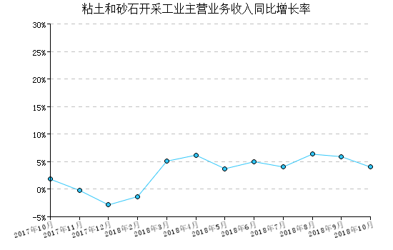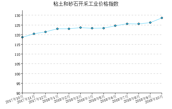 2018年10月,粘土和砂石开采工业产品出厂价格指数为128.60,比上月上涨1.91%,比去年同月上涨8.40%,一月至本月平均比去年同期上涨8.81%。