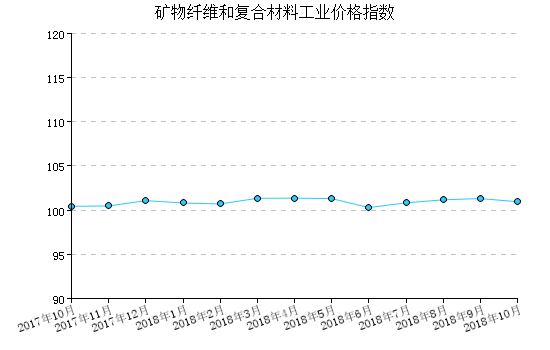 2018年10月,矿物纤维和复合材料工业产品出厂价格指数为100.96,比上月下降0.35%,比去年同月上涨0.52%,一月至本月平均比去年同期上涨1.05%。 图 1:矿物纤维和复合材料工业产品出厂价格指数